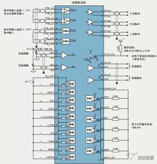 (1)用于SINAMICS V90的24V電源。所有的PTO信號都必須連接至使用同一24V電源的控制器,如SINAMICS V90。